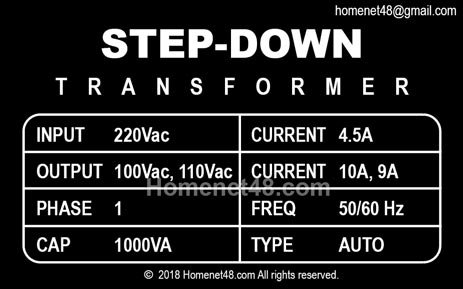 - เป็นแบบ Stepdown ใช้แปลงระบบไฟจาก 220V เป็น 110V หรือ 100V (มีช่องเสียบไฟแยก 2 ค่าให้เลือกค่า Volt แตกต่างกัน)